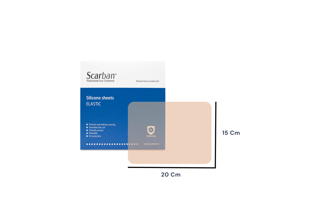 لصقة السيليكون شفافة بقياس 15 × 20 سم من Scarban® مصممة لتغطية الندوب الواسعة الناتجة عن الجراحة والإصابات والحروق، أو تلك الموجودة على الظهر.